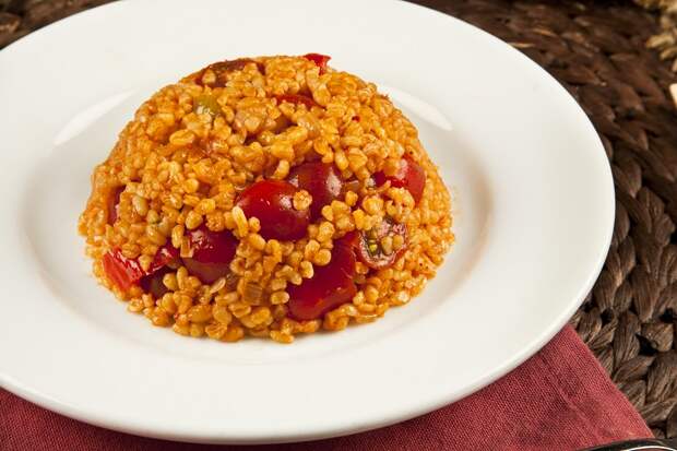 Булгур (пшеница, которая была собрана в момент своей молочной зрелости, основательно высушена и раздроблена до маленьких квадратных кусочков) варится 15–20 минут под крышкой на слабом огне.